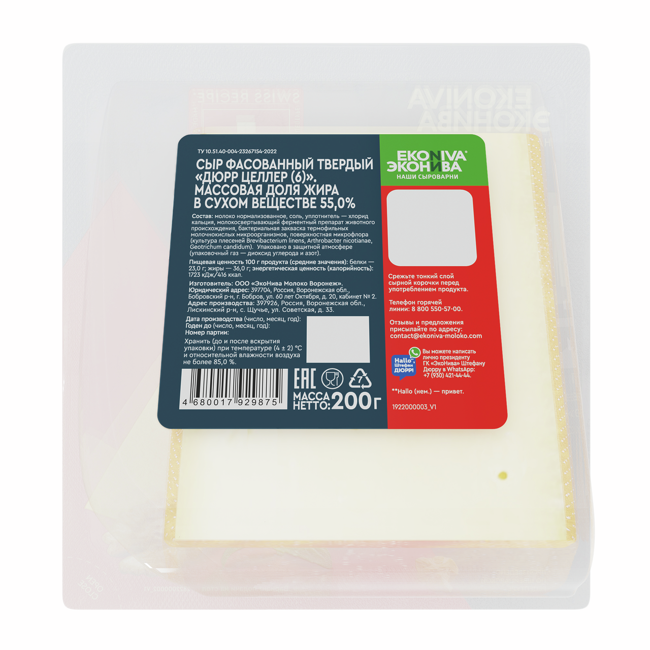 Сыр Эконива Дюр Целлер твердый 6 месяцев выдержки 55%, 200г