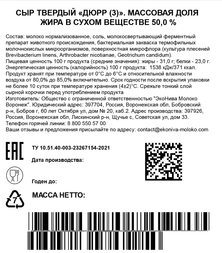 Сыр Эконива Дюрр твердый 3 месяца выдержки 50%, ~900г
