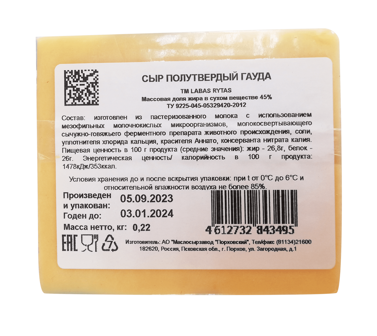 Сыр Labas Rytas Гауда полутвердый 45%, 220г