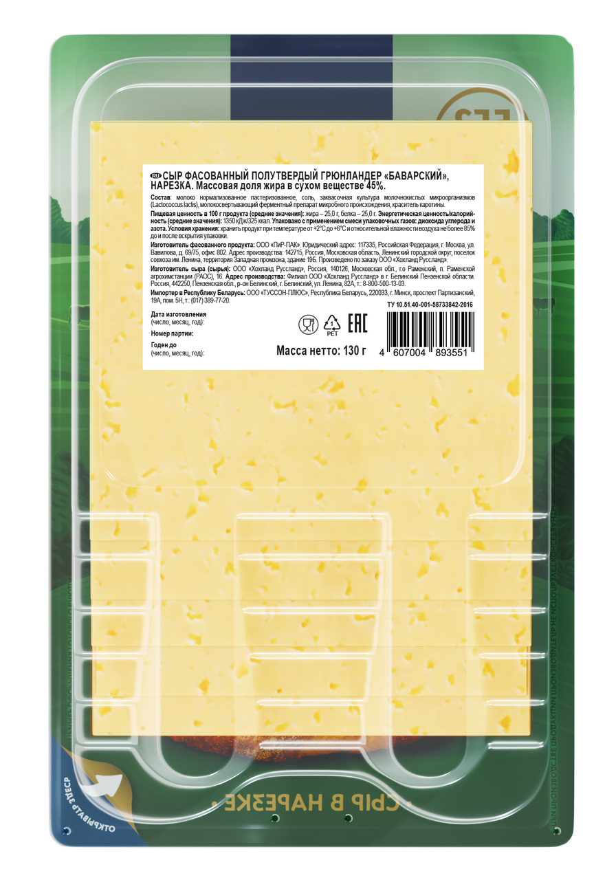 Сыр Grunlander Баварский нарезка 45%, 130г