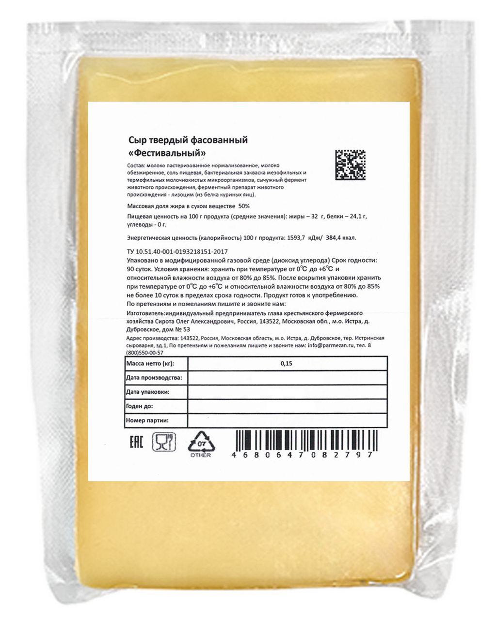 Сыр Истринская Сыроварня Олега Сироты Фестивальный твердый 50%, 150г