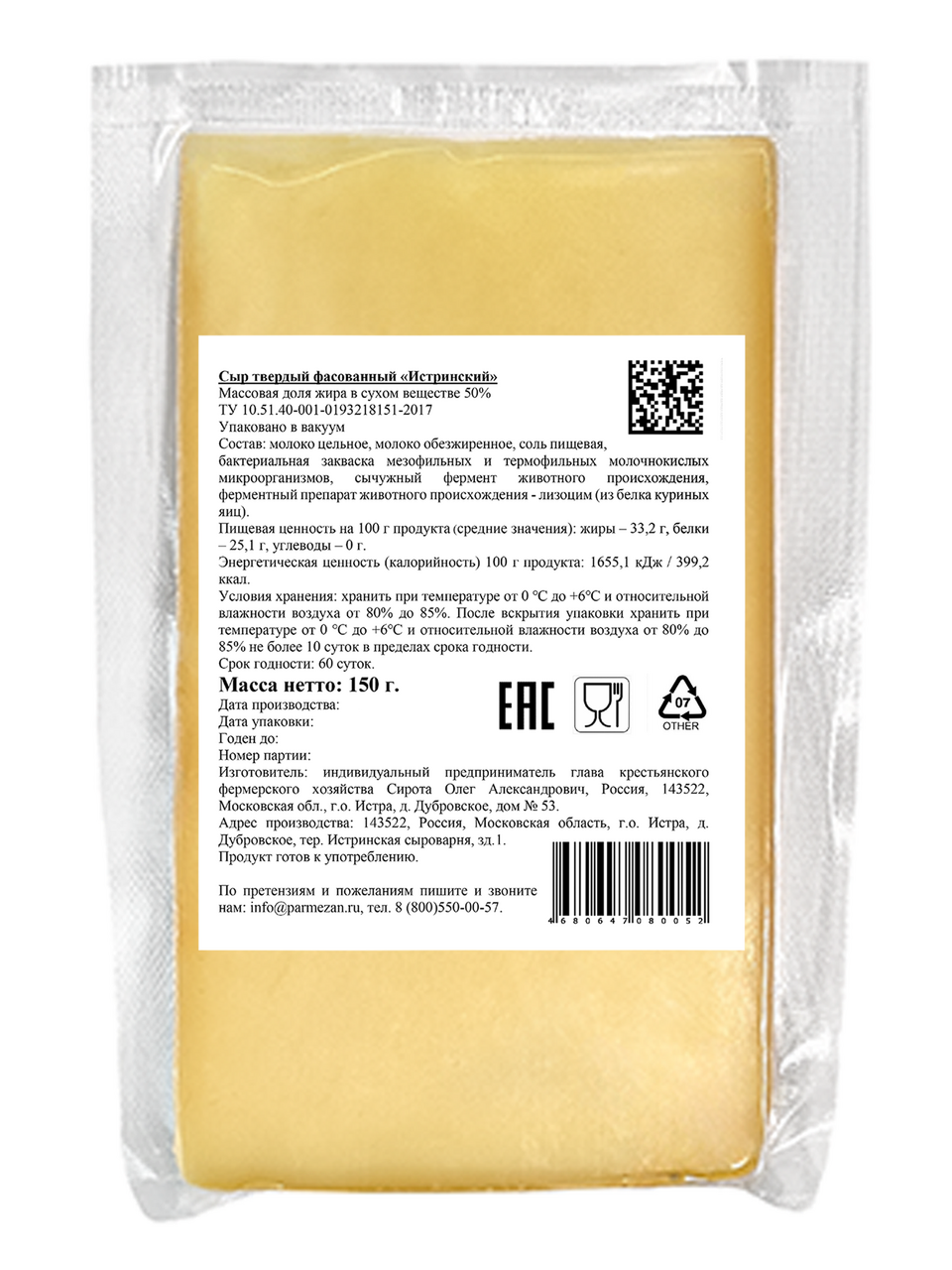 Сыр Истринская Сыроварня Олега Сироты Истринский кусок 50%, 150г