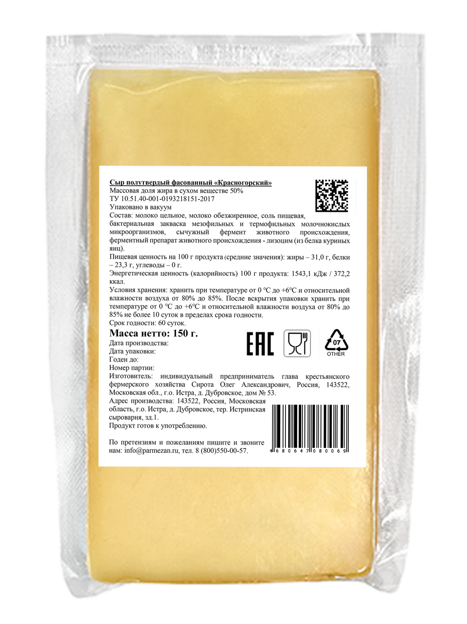 Сыр Истринская Сыроварня Олега Сироты Красногорский кусок 50%, 150г