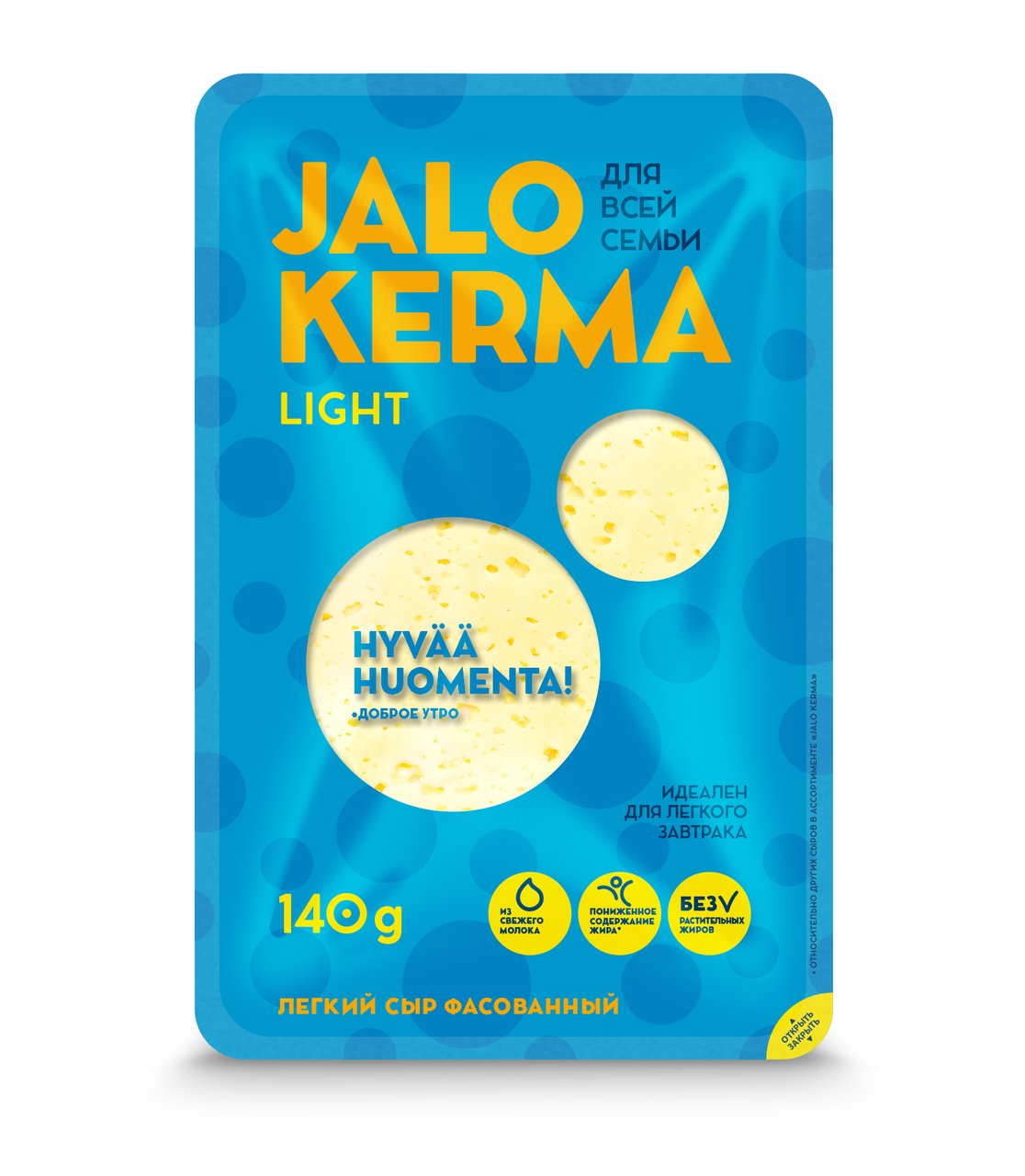Лёгкий сыр Jalo Kerma 30% имеет пониженное содержание жира, при этом отличается мягким сливочным вкусом и ароматом. Произведен из свежего коровьего молока, без растительных заменителей молочного жира, по особым рецептурам со знанием финских традиций. Сыр обладает нежной, однородной и в меру пластичной структурой. Рисунком в виде круглых и овальных глазков, порезан на тонкие слайсы, которые удобно ложатся на хлеб, а перезакрываемая упаковка позволяет сохранить качество продукта надолго.