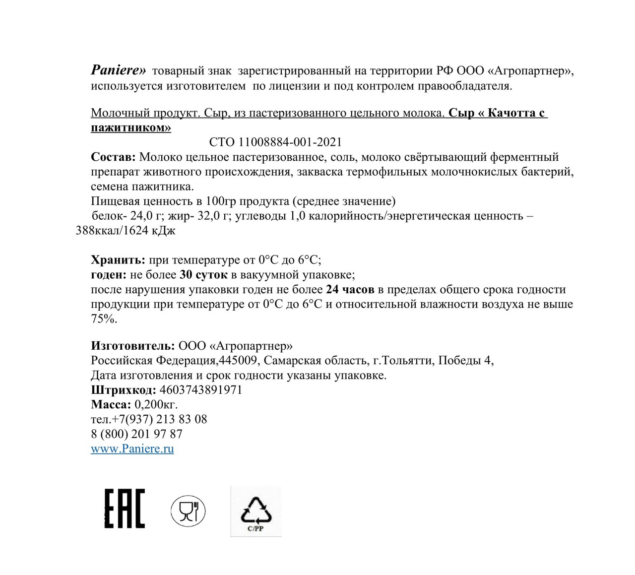 Сыр Paniere Качотта с пажитником полутвердый 32%, 200г