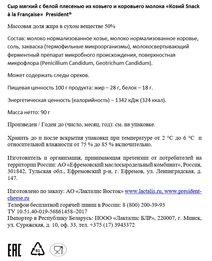 Сыр козий President Snack с белой плесенью 50%, 90г