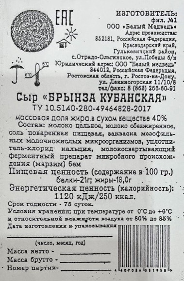 Молоко цельное, молоко обезжиренное, соль поваренная пищевая, закваска мезофильных молочнокислых микроорганизмов, уплотнитель-хлорид кальция, молокосвертывающий ферментный препарат микробного происхождения (марзим).