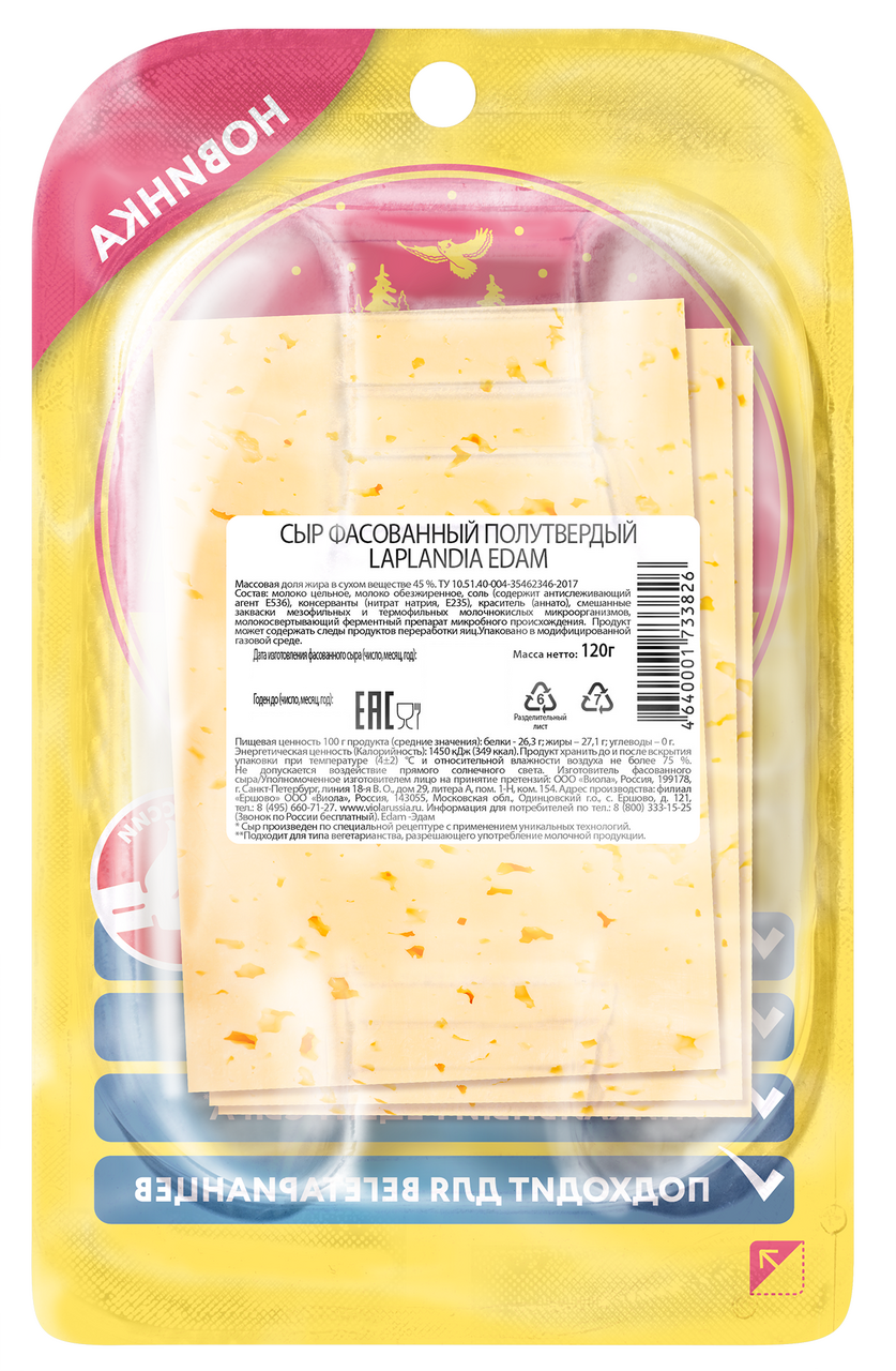 Сыр Laplandia Эдам полутвердый без лактозы нарезка 45%, 120г