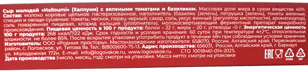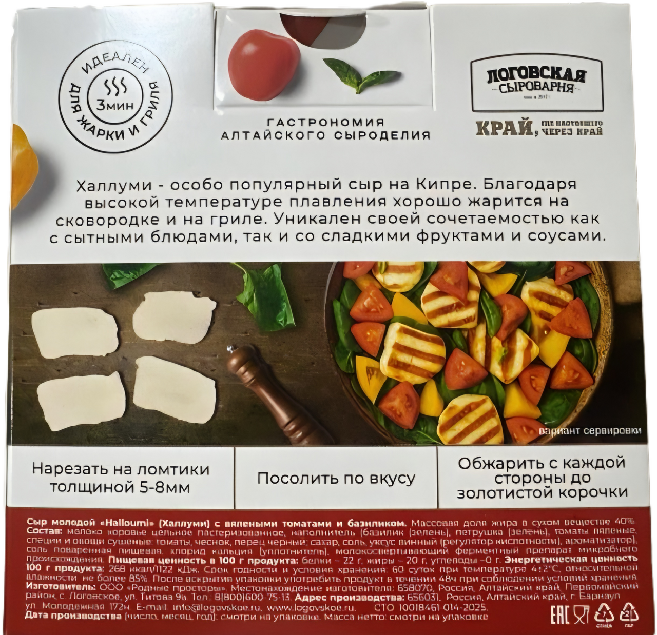 Сыр Логовская сыроварня Халлуми вяленые томаты и базилик, 140г