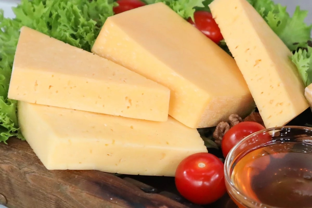 Классический полутвердый сыр с мелкими неравномерными глазками, эластичной упругой текстурой и гладкой поверхностью среза. Консистенция однородная, эластичная. Тесто слегка ломкое на изгибе.