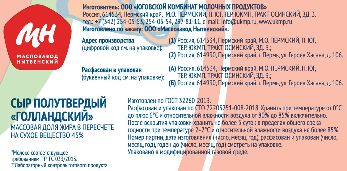 Сыр Маслозавод Нытвенский Голландский полутвердый 45%, 180г