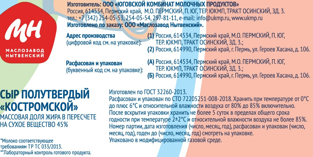 Сыр Маслозавод Нытвенский Костромской полутвердый 45%, 180г