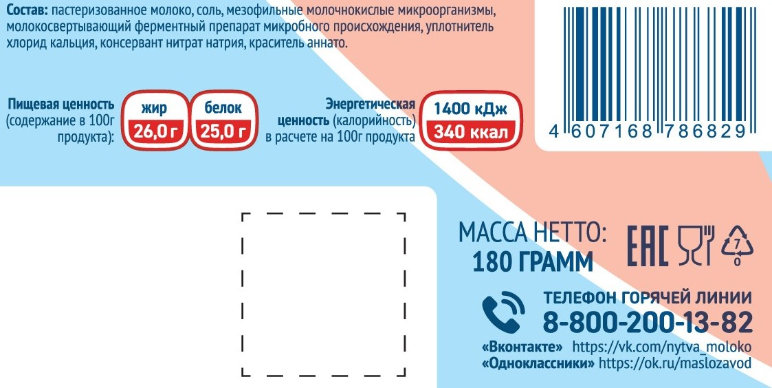 Пастеризованное молоко; соль; мезофильные молочнокислые микроорганизмы; молокосвертывающий ферментный препарат микробного происхождения; уплотнитель хлорид кальция; консервант нитрат натрия; краситель аннато.