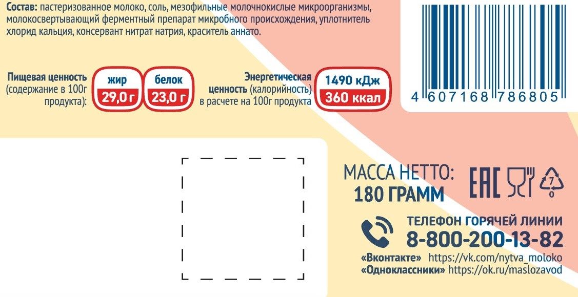 Пастеризованное молоко; соль; мезофильные молочнокислые микроорганизмы; молокосвертывающий ферментный препарат микробного происхождения; уплотнитель хлорид кальция; консервант нитрат натрия; краситель аннато.