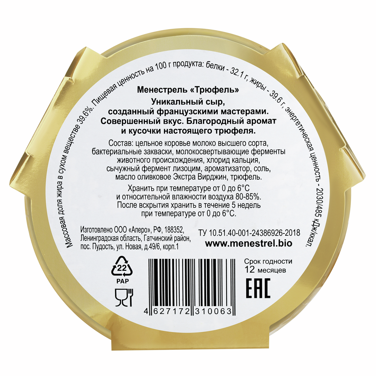 Цельное коровье молоко высшего сорта, бактериальные закваски, молокосвертывающий фермент растительного происхождения, хлорид кальция, лизоцим, ароматизатор, соль, масло оливковое Экстра Вирджин, трюфель.