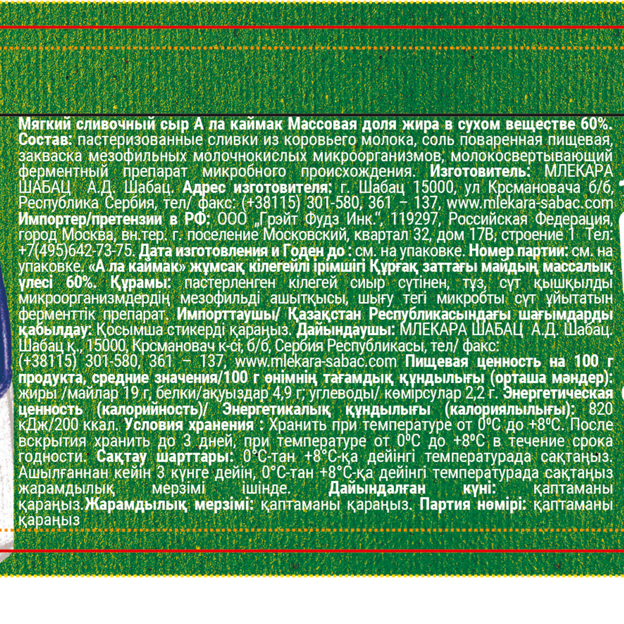 Сыр Mlekara Sabac мягкий а ла каймак 60%, 250г