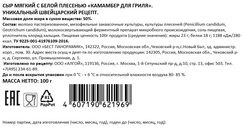 Молоко пастеризованное, мезофильные заквасочные культуры, культуры плесеней Penicillium candidum, Geotrichum candidum, молокосвертывающий ферментный препарат микробного происхождения, соль пищевая, уплотнитель хлорид кальция.