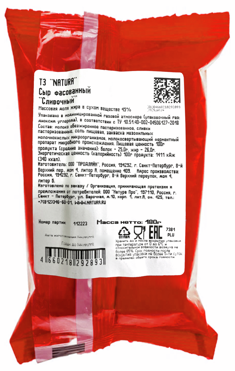 Сыр Natura сливочный безлактозный кусок 45%, 180г