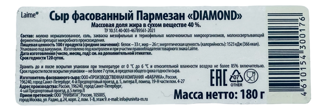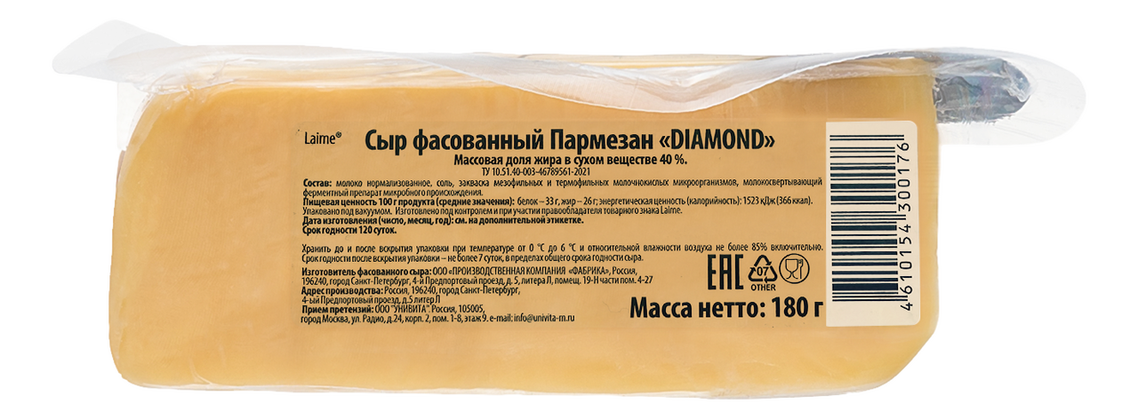 Сыр Laime Diamond Пармезан твердый 40%, 180г