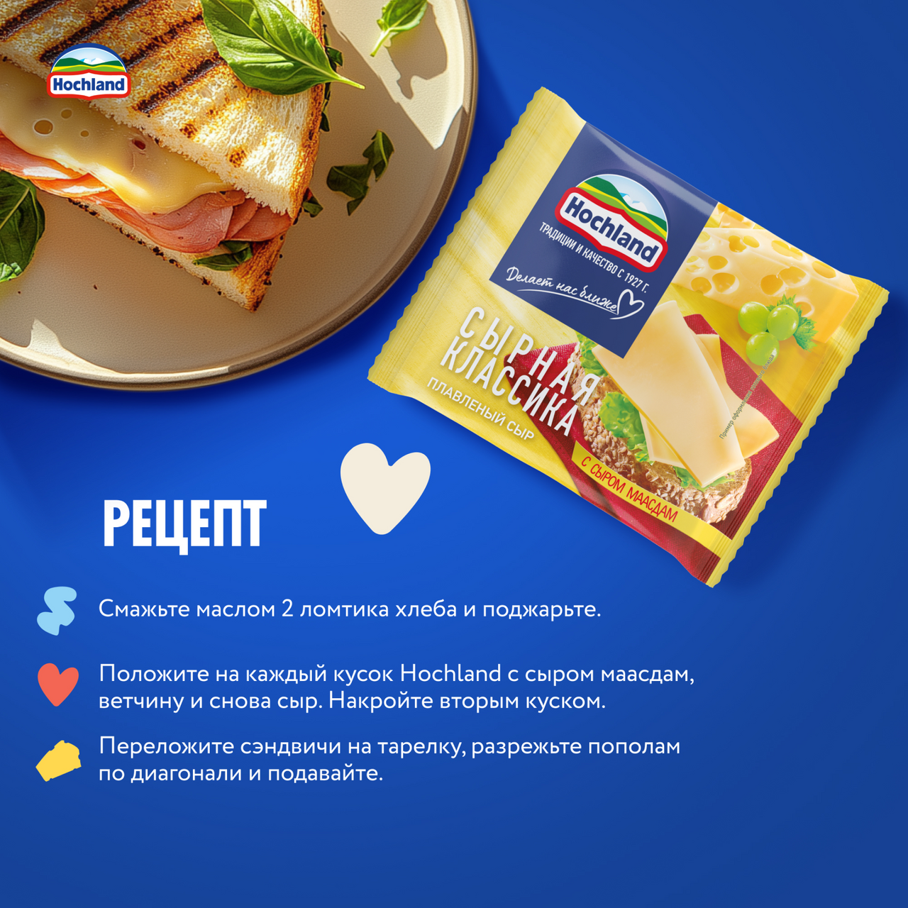 Hochland с сыром Маасдам - это богатый сырный вкус в линейке плавленого сыра в ломтиках. Любители плавленого сыра могут насладиться богатым вкусом Маасдама в плавленом сыре Hochland в ломтиках, которые так удобно класть на бутерброд. Ломтики плавленого сыра упакованы в индивидуальную упаковку. Благодаря удобной упаковке их можно есть не только дома, но и брать с собой на прогулку, пикник, на учебу или работу.