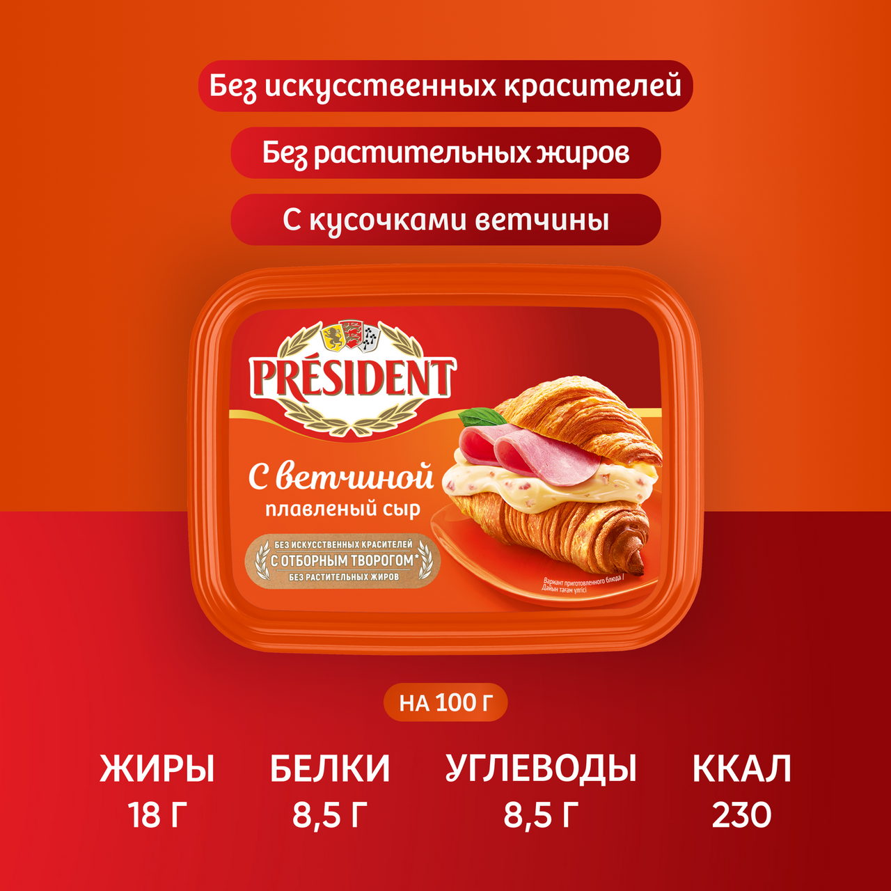 Сыр плавленый President с ветчиной обладает сливочным вкусом с копчеными нотками и нежной однородной текстурой, которую дополняют кусочки настоящей ветчины. Он изготовлен из твердых сортов сыра с добавлением отборного творога, масла и молока. В составе нет растительных жиров и искусственных красителей. Плавленый сыр идеально подойдет для бутербродов и тостов на завтрак. Он отлично сочетается со свежими овощами, зеленью, мясом и гармонично дополняет вкус других ингредиентов. С сыром President также можно приготовить вкусные блюда для перекуса, например сэндвичи или рулетики из лаваша. История бренда President началась в 1968 году во Франции, а сейчас наши продукты являются неотъемлемой частью жизни миллионов людей по всему миру. President — это всегда высочайшее качество и безупречный вкус, а также искусство получать удовольствие от жизни!