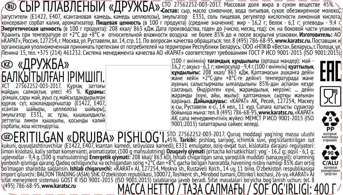 Это легендарный плавленый сыр, изготовленный из твердых сыров высокого качества с добавлением свежих пастеризованных сливок. На протяжении 50 лет он остается визитной карточкой завода Карат, тем самым вкусом и качественным составом, знакомым с детства.