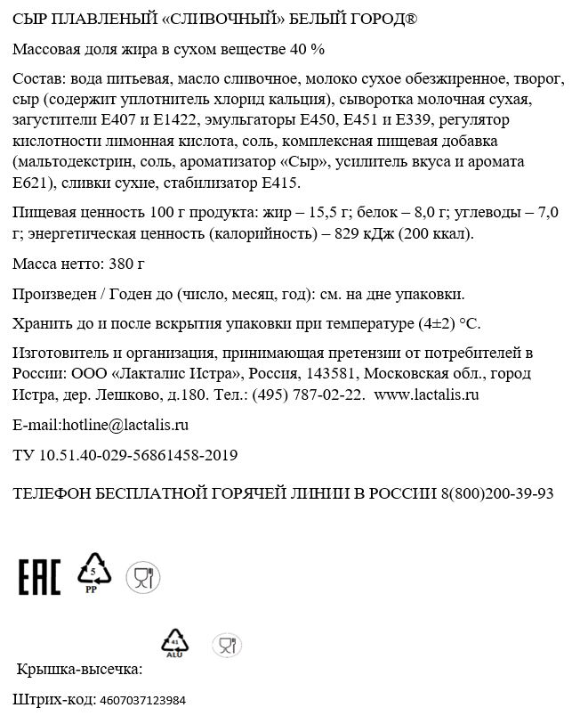 Вода питьевая, масло сливочное, молоко сухое обезжиренное, творог, сыр (содержит уплотнитель хлорид кальция), сыворотка молочная сухая, загустители Е407 и Е1422, эмульгаторы Е450, Е451 и Е339, регулятор кислотности лимонная кислота, соль, комплексная пищевая добавка (мальтодекстрин, соль, ароматизатор Сыр, усилитель вкуса и аромата Е621), сливки сухие, стабилизатор Е415.
