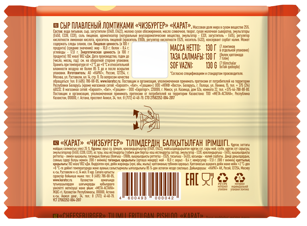 Сыр плавленый Карат Чизбургер в ломтиках 25%, 130г