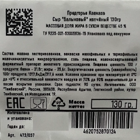 Сыр Предгорье Кавказа Балыковый копченый 45%, 130г