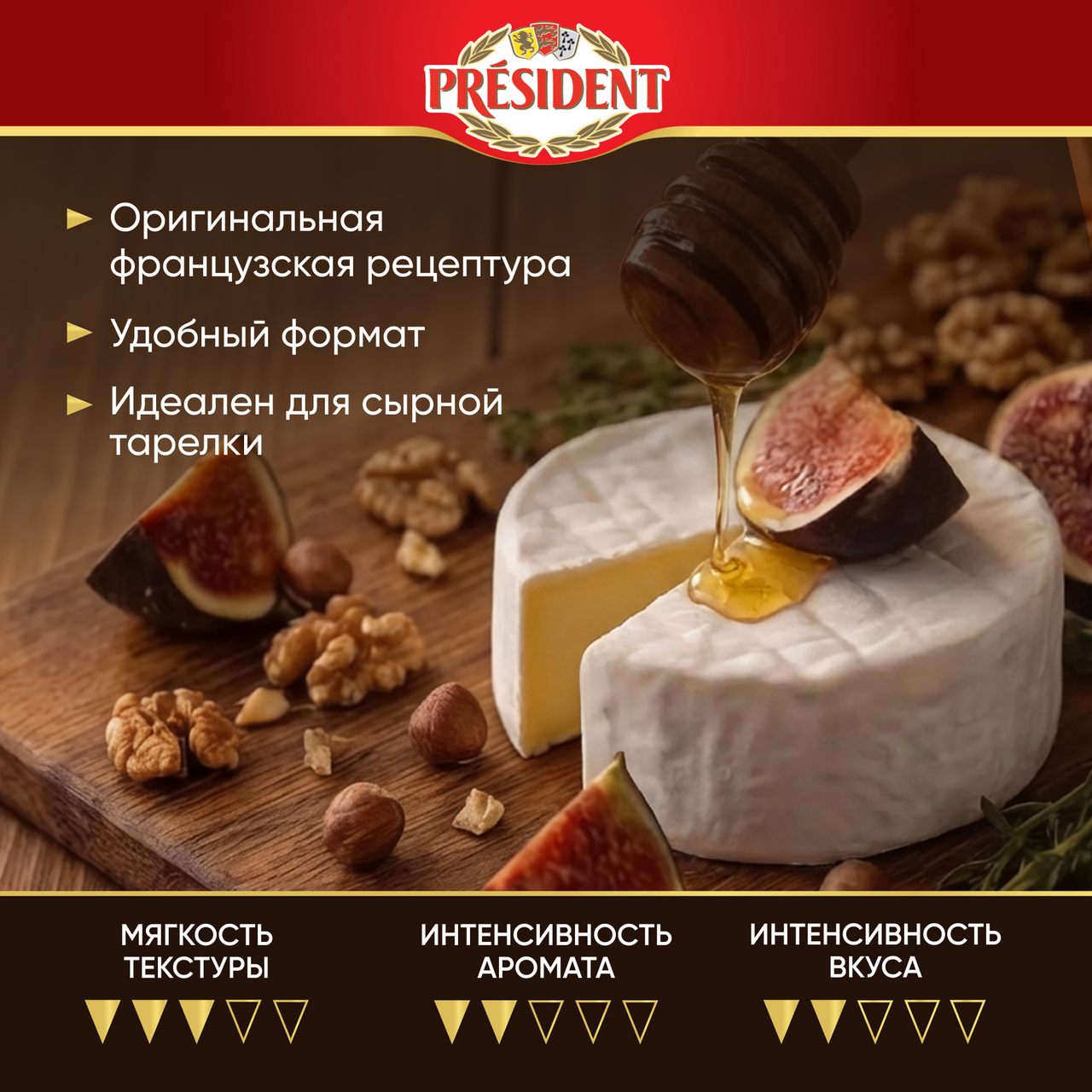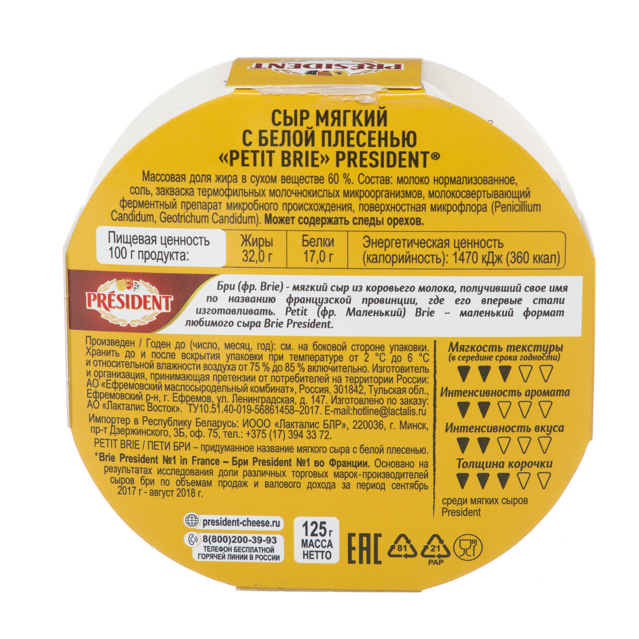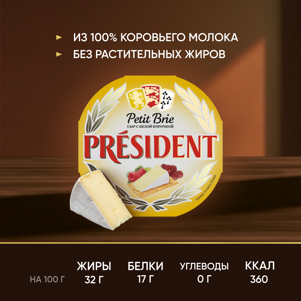 Сыр мягкий President Petit Brie с белой плесенью — это нежнейшая текстура, приятный сливочный вкус и бархатистая съедобная корочка. Один из самых популярных мягких сыров с белой корочкой, без которого не обходится ни одна сырная тарелка! Сыр бри станет самостоятельным блюдом или приятным дополнением к ужину и отличной закуской. Подайте сыр с белой плесенью после основного блюда в качестве десерта — он сочетается с фруктами, медом, темным шоколадом и кедровыми орехами. С мягким сыром можно готовить и другие блюда: легкие салаты, открытые пироги, сочную кесадилью. История бренда President началась в 1968 году во Франции, а сейчас наши продукты являются неотъемлемой частью жизни миллионов людей по всему миру. President — это всегда высочайшее качество и безупречный вкус, а также искусство получать удовольствие от жизни!