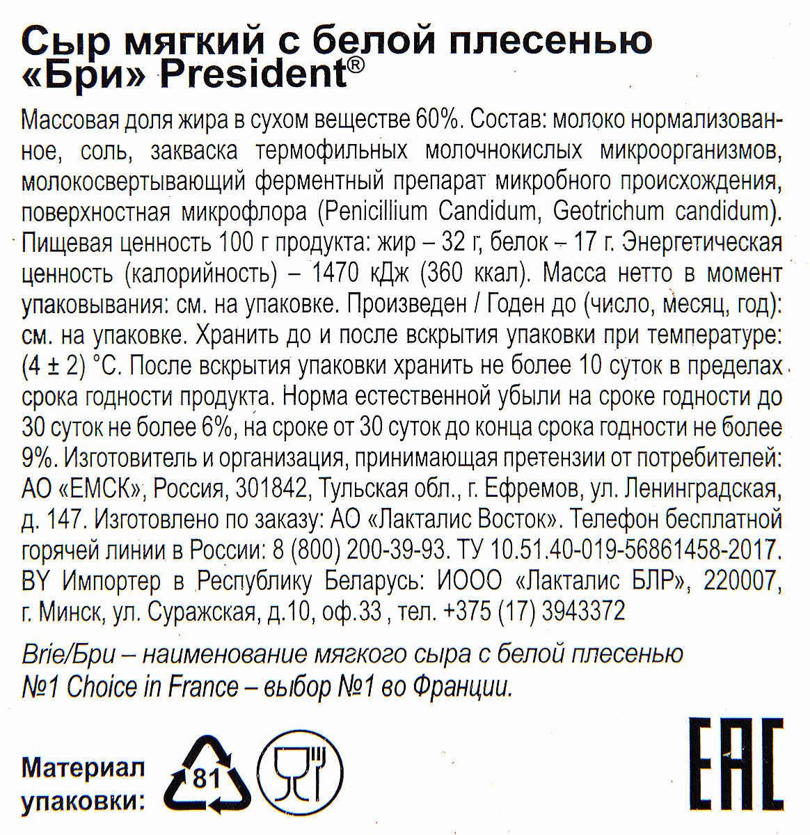 Молоко животного происхождения нормализованное, соль поваренная, закваска термофильных молочнокислых микроорганизмов, молокосвертывающий ферментный препарат микробного происхождения, поверхностная микрофлора (Penicillium Candidum, Geotrichum candidum).