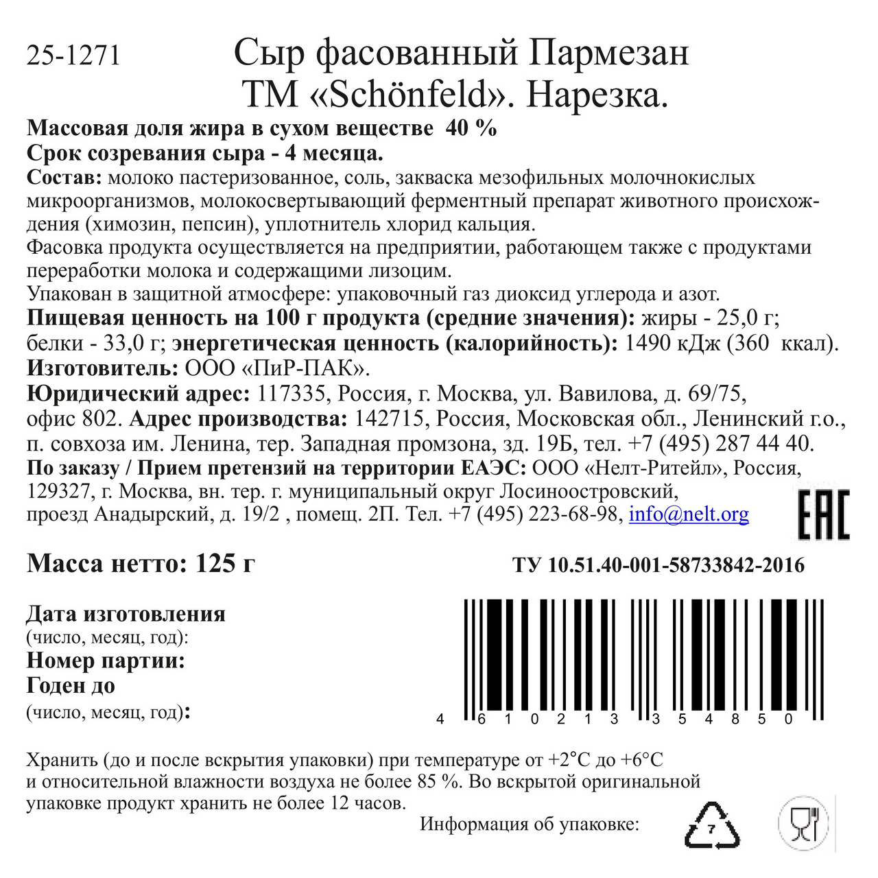 Сыр Schonfeld Пармезан нарезка 40%, 125г