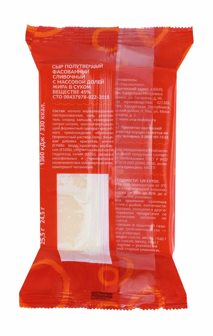 Молоко нормализованное пастеризованное, бактериальная закваска мезофильных и термофильных молочнокислых микроорганизмов, соль поваренная пищевая, уплотнитель хлорид кальция пищевой краситель Аннато, молокосвертывающий ферментный препарат микробиального происхождения, консервант нитрат натрия, консервант натамицин.