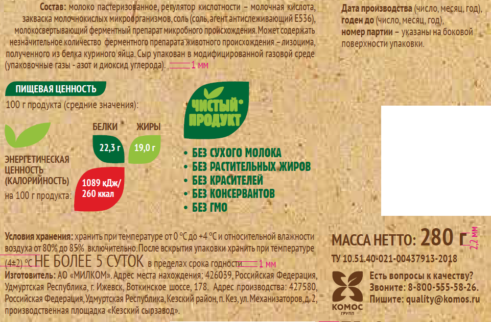 Молоко пастеризованное, регулятор кислотности – молочная кислота, закваска молочнокислых микроорганизмов, соль (соль, агент антислеживающий Е536), молокосвертывающий ферментный препарат микробного происхождения.