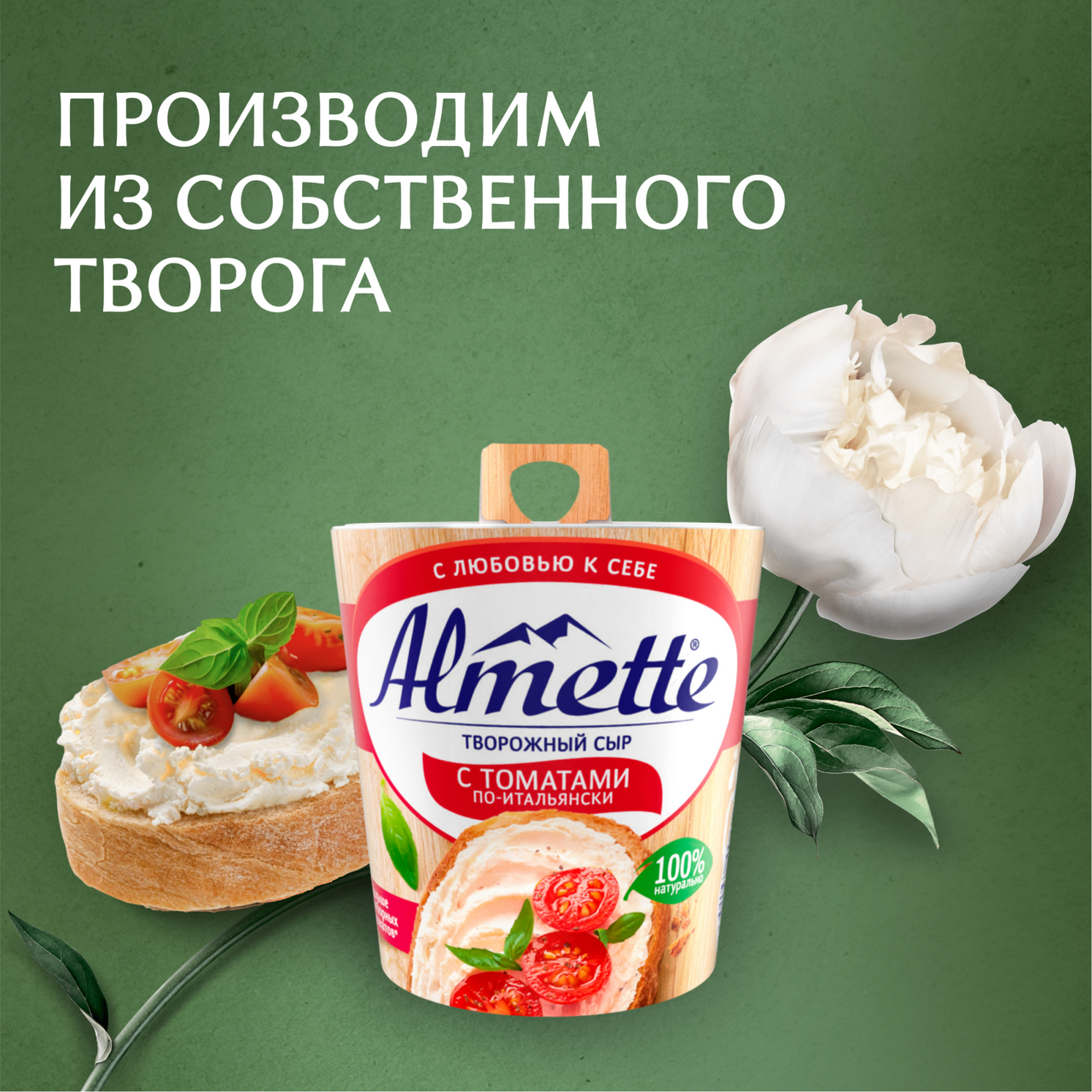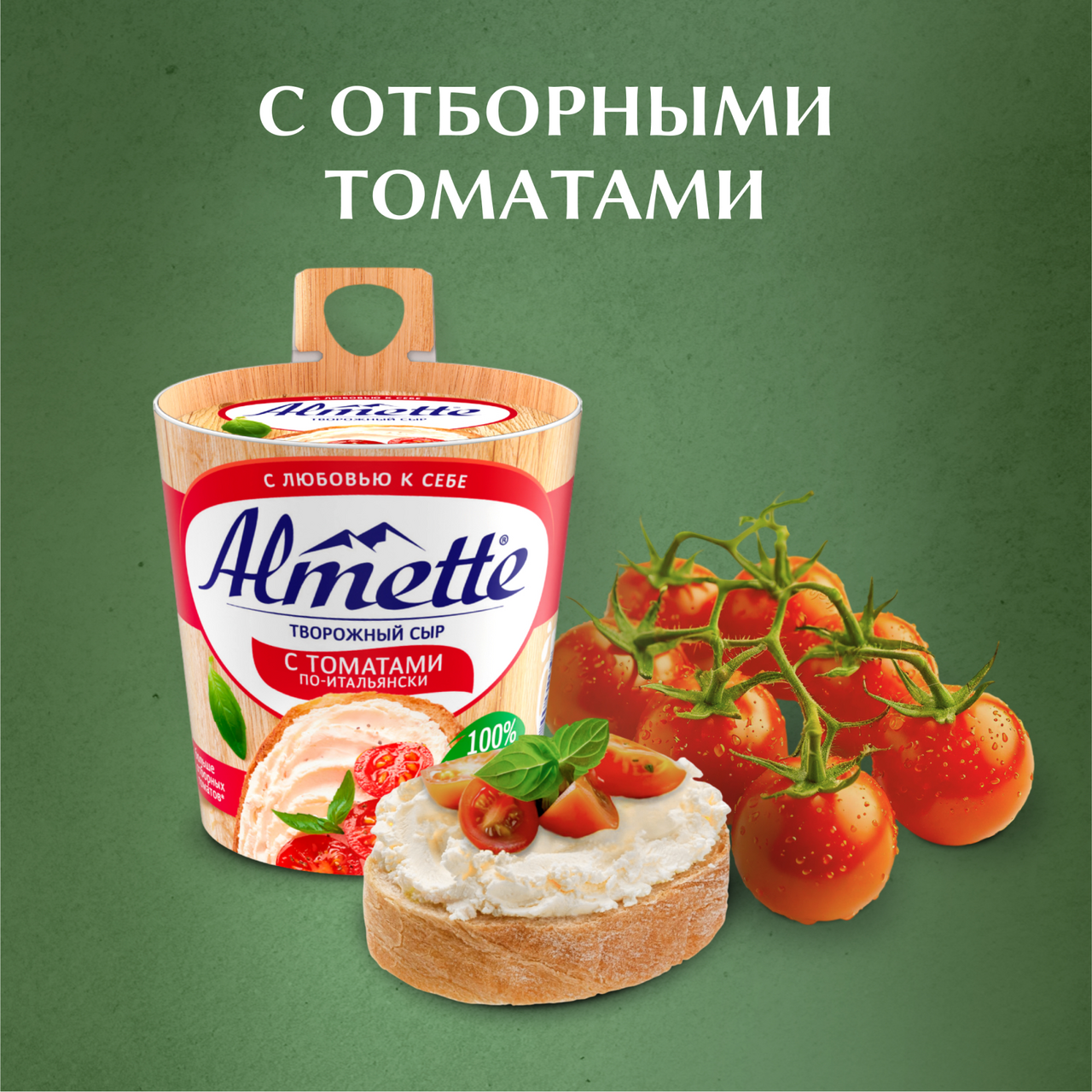 Almette с томатами по-итальянски — нежный творожный сыр с кусочками настоящих томатов и ароматными травами. Сыр с бархатистой текстурой и ярким сбалансированным вкусом изготовлен из 100% натуральных ингредиентов, окуная вас в атмосферу солнечной Италии.Сыр творожный Almette разнообразит закуски, завтраки и перекусы. Он идеально подойдет для брускетт, канапе и круассанов или дополнит кусочек хрустящего багета, придавая особенный средиземноморский акцент. А еще сыр Almette с томатами по-итальянски можно есть без каких-либо дополнений, ощущая еще больше свежих отборных томатов* и любовь к себе в каждой ложке.*По сравнению с предыдущим рецептом продукта