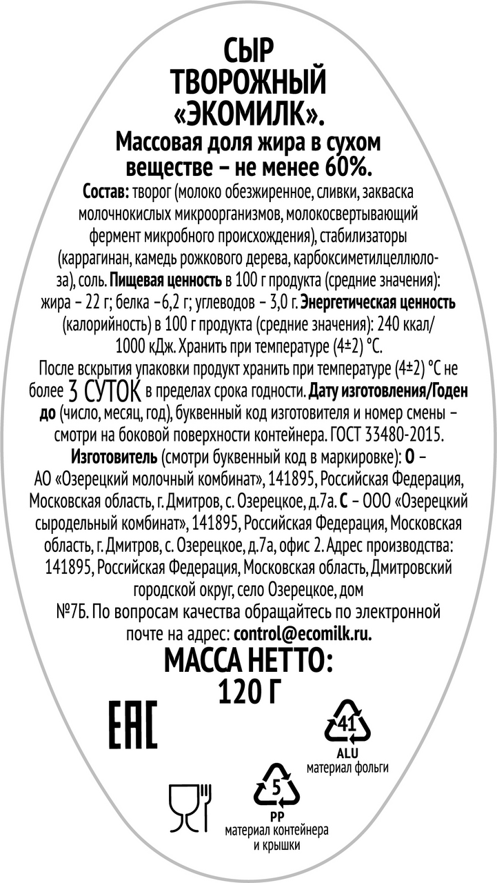 Сыр творожный Экомилк сливочный 60%, 120г