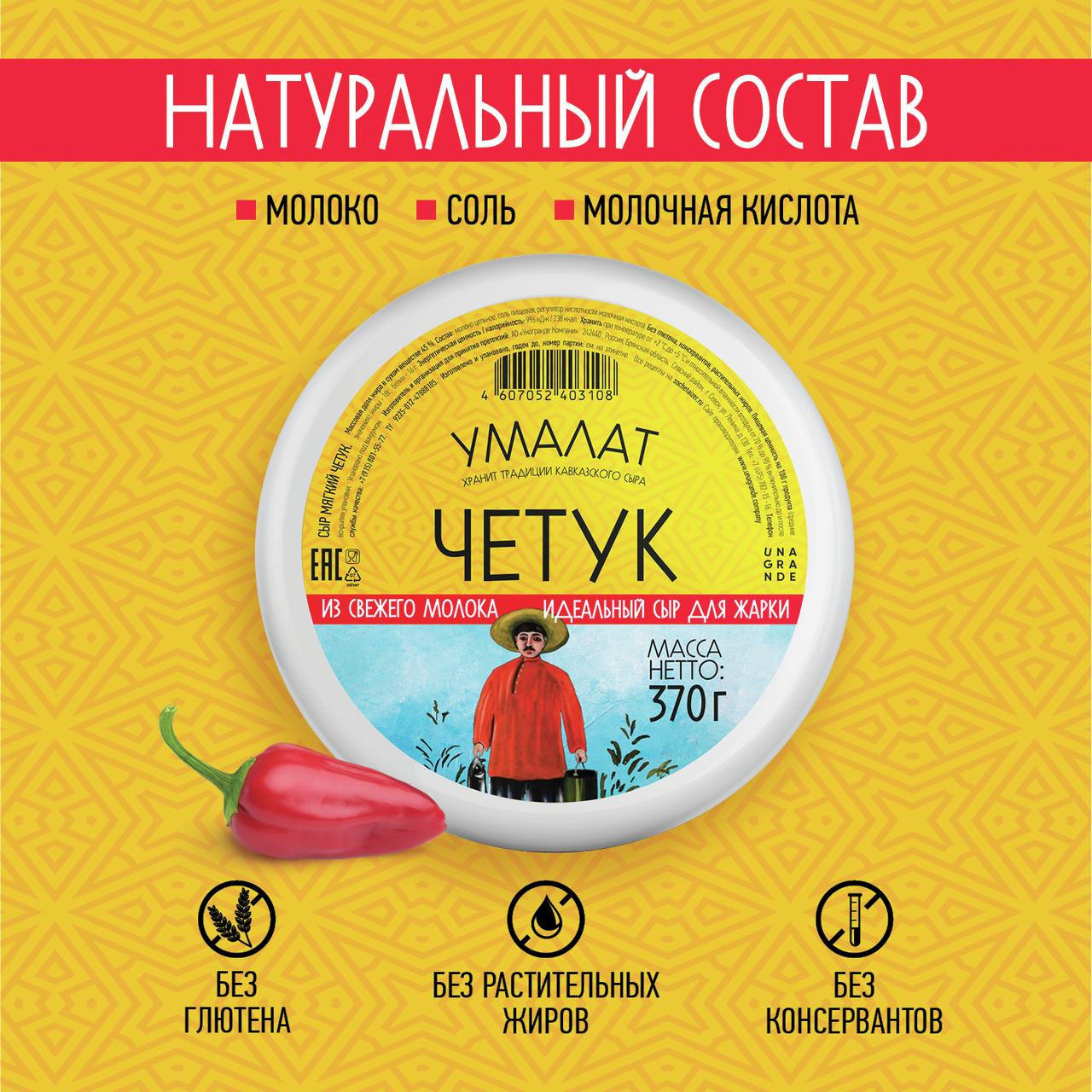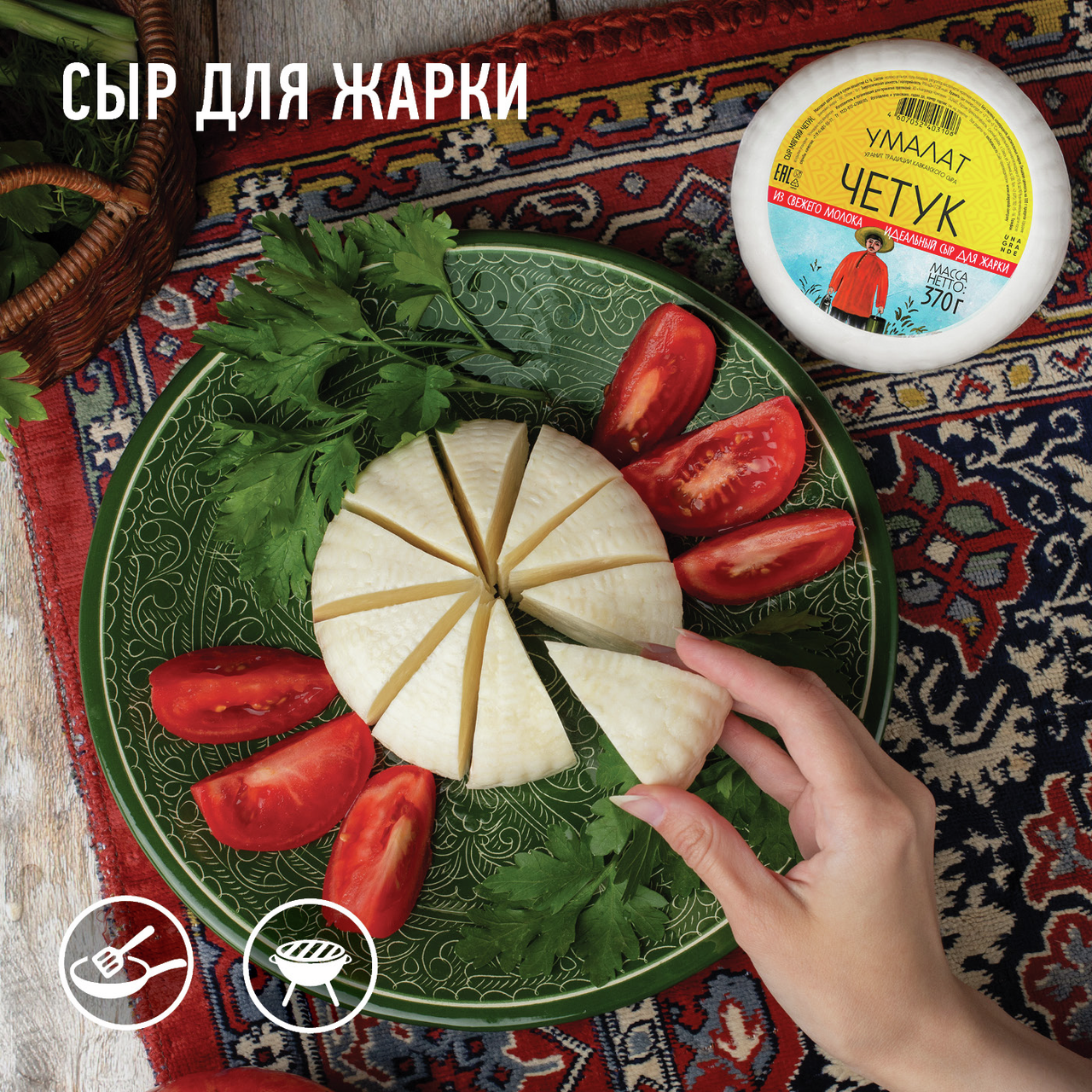 Сыр Умалат Четук, 370 г отличается неповторимой нежной консистенцией, оригинальным кисломолочным вкусом и характерной для этого сорта текстурой. Производитель использует для его изготовления исключительно натуральные ингредиенты, что объясняет его вкусовые качества. Этот сыр полезен: в составе имеется много витаминов, незаменимых аминокислот и микроэлементов. Благотворно влияет на пищеварение, работу организма в целом и рекомендован для использования в диетических столах. Четчук легко усваивается, он низкокалорийный (по сравнению с твердыми сортами) и обладает приятным вкусом. Поскольку в состав входит только молоко и соль, его можно давать даже маленьким детям. Идеально подходит для салатов, горячих и холодных закусок, выпечки, для приготовления вторых ��люд, запеканок и сырных тарелок. Может использоваться для жарки или как самостоятельная закуска.