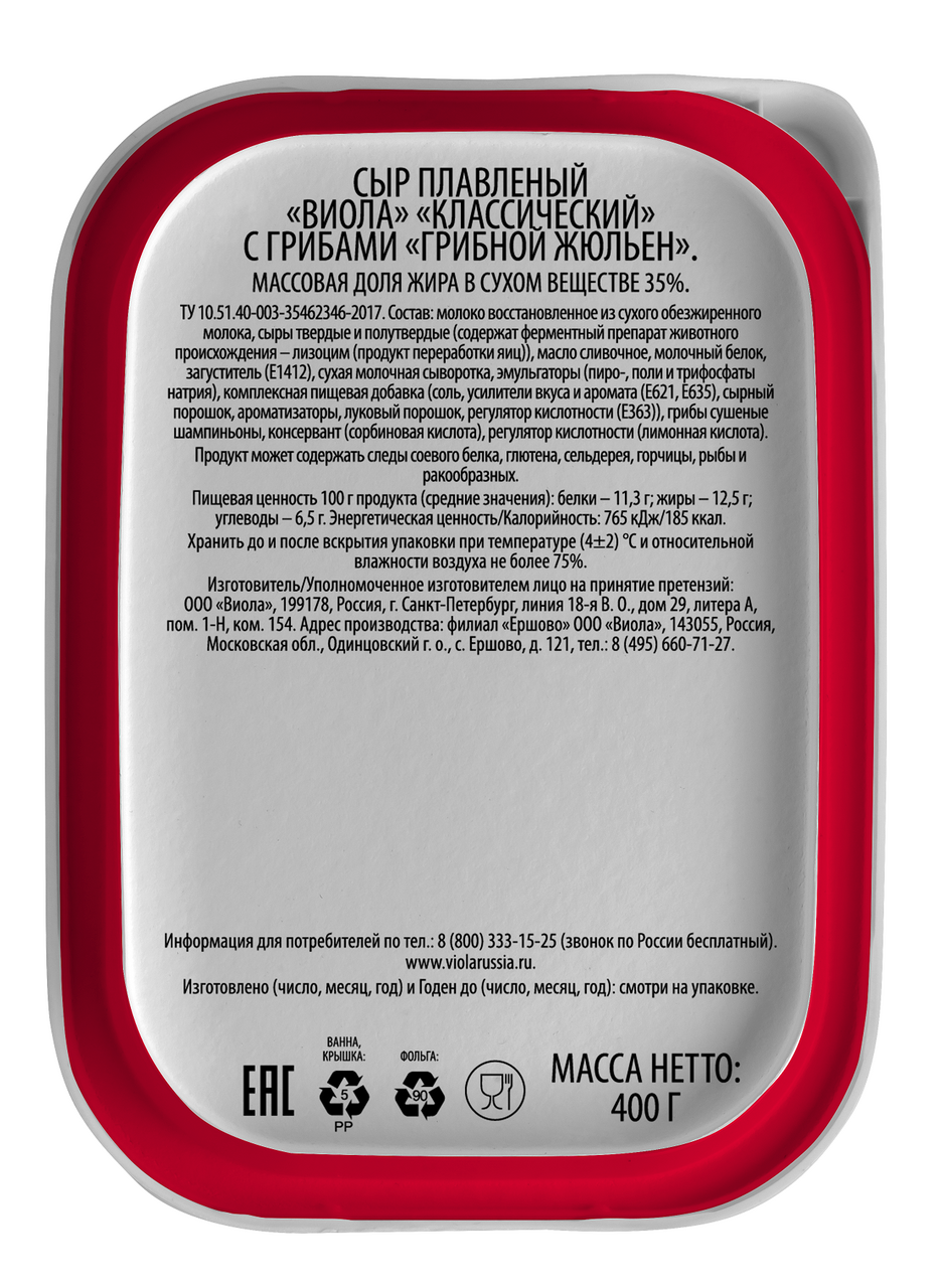 Великолепный сливочно-грибной вкус любимого блюда классической французской кухни, ведь в наш плавленый сыр мы добавили очень много грибов шампиньонов. Продукция Viola проходит многоступенчатый контроль качества на производстве и полностью соответствует высоким стандартам, принятым в компании. Концерн на корпоративном уровне отказывается от использования в производстве заменителей молочного жира.