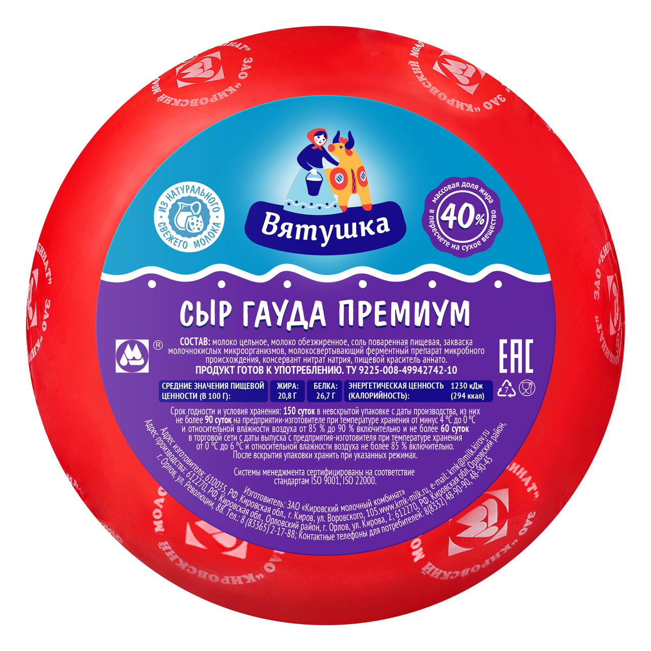 Сыр Вятушка Гауда Премиум 40%, ~500г