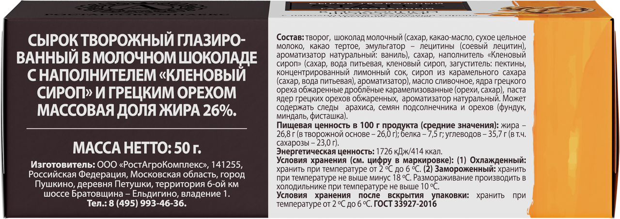 Сырок творожный глазированный А.Ростагрокомплекс с кленовым сиропом и грецким орехом в молочном шоколаде 26%, 50г