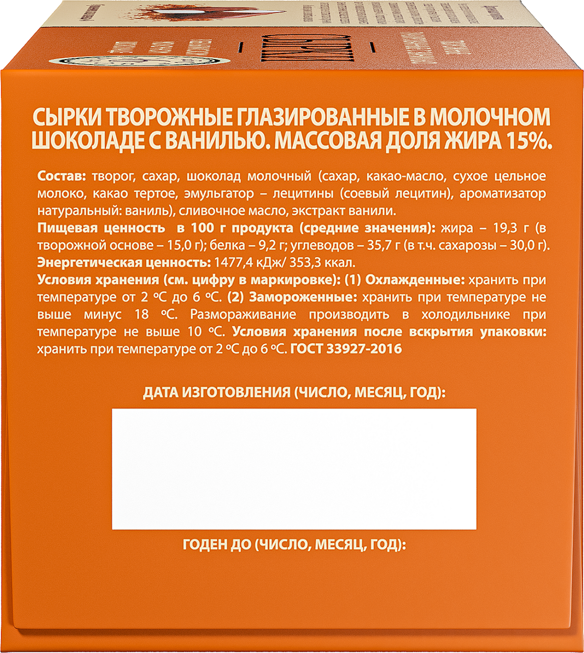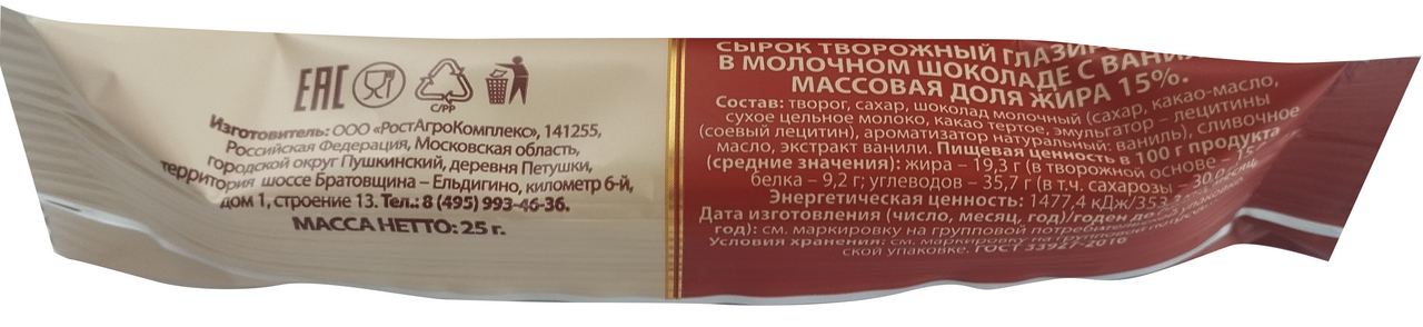 Сырок творожный глазированный А.Ростагрокомплекс с ванилью в молочном шоколаде 15%, без змж - это оригинальный творожный десерт с приятным ванильным ароматом. В каждой коробке скрываются по 6 палочек из творога и ванили, покрытых натуральным бельгийским шоколадом. Палочки имеют нежную текстуру и идеально подходят для завтрака, легкого обеда или перекуса.