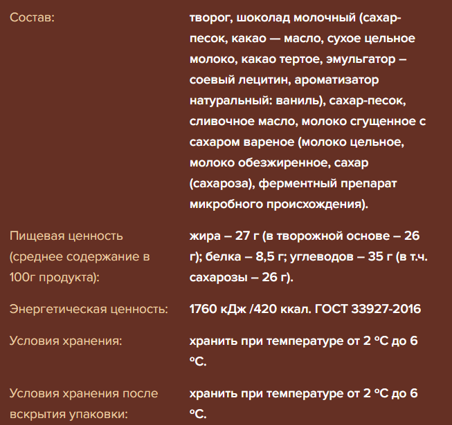 Творог, шоколад молочный сахар, какао - масло, сухое цельное молоко, какао тертое, эмульгатор: лецитины соевый лецитин, ароматизатор натуральный: ваниль, сахар, сливочное масло, молоко сгущенное с сахаром вареное молоко нормализованное, сахар сахароза.