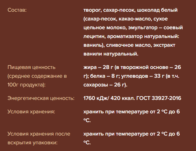 Творог, сахар, шоколад белый (сахар, какао-масло, сухое цельное молоко, эмульгатор – лецитины (соевый лецитин), ароматизатор натуральный: ваниль), сливочное масло, экстракт ванили.