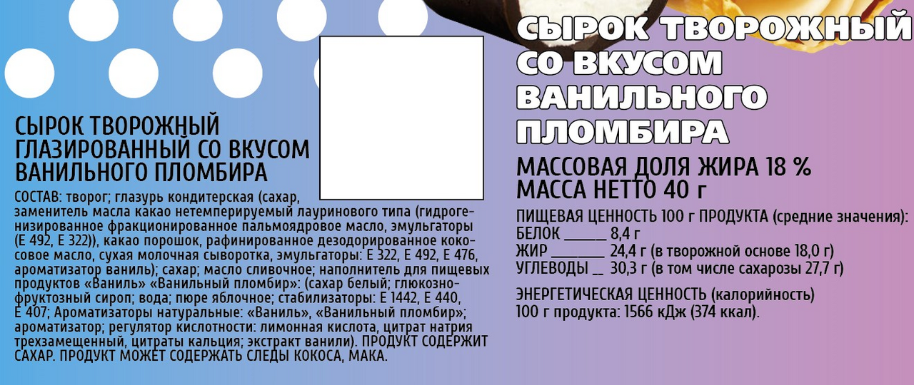 Творог, глазурь кондитерская сахар, заменитель масла какао нетемперируемый лауринового типа гидрогенизированное фракционированное пальмоядровое масло, эмульгаторы Е492, Е322, какао порошок, рафинированное дезодорированное кокосовое масло, сухая молочная сыворотка, эмульгаторы: Е 322, Е 492, Е476, ароматизатор ваниль; сахар; масло сливочное; наполнитель для пищевых продуктов Ваниль Ванильный пломбир: сахар белый; глюкозно-фруктозный сироп; вода; пюре яблочное; стабилизаторы: Е1442, Е440, Е407; Ароматизаторы натуральные: Ваниль, Ванильный пломбир; ароматизатор; регулятор кислотности: лимонная кислота, цитрат натрия трехзамещенный, цитраты кальция; экстракт ванили.