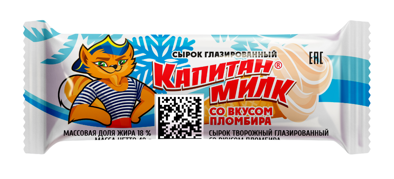 Сырок творожный глазированный Капитан Милк со вкусом пломбира c массовой долей жира 18%, пачка 40г. Продукт изготовлен по ГОСТу. Без заменителей молочного жира. это творожное лакомство из натурального творога с сахаром и сливочным маслом, покрытое плотным слоем кондитерской глазури с какао. Питательный продукт для сытного перекуса или десерт к чаю.