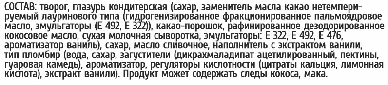 Творог, глазурь кондитерская (сахар, заменитель масла какао нетемперируемый лауринового типа (гидрогенизированное фракционированное пальмоядровое масло, эмульгаторы (E 492, E 322)), какао-порошок, рафинированное дезодорированное кокосовое масло, сухая молочная сыворотка, эмульгаторы: E322, E 492, E476, ароматизатор ваниль), сахар, масло сливочное, наполнитель с экстрактом ванили, тип пломбир (вода, сахар, загустители (дикрахмаладипат ацетилированный, пектины,