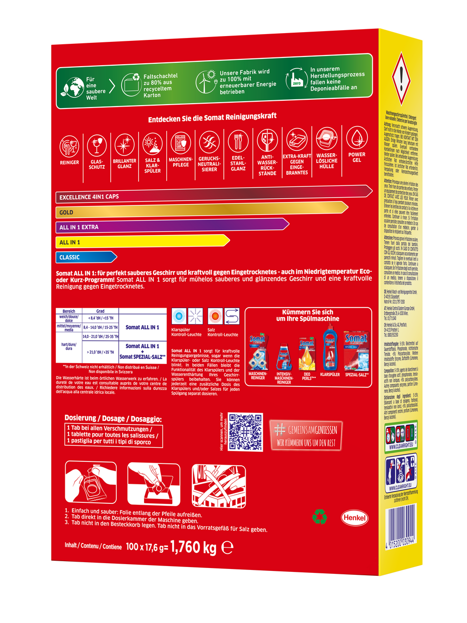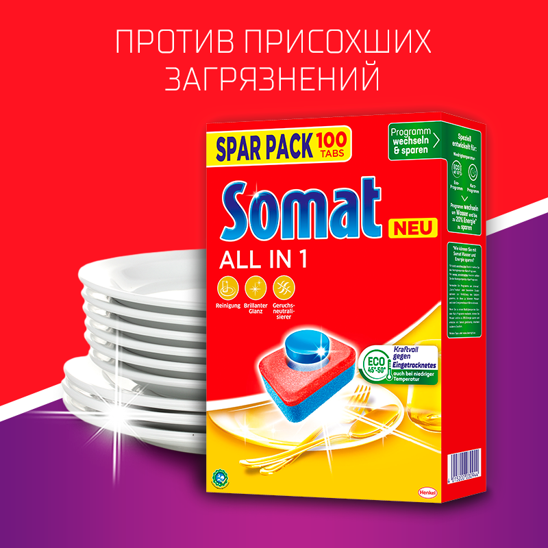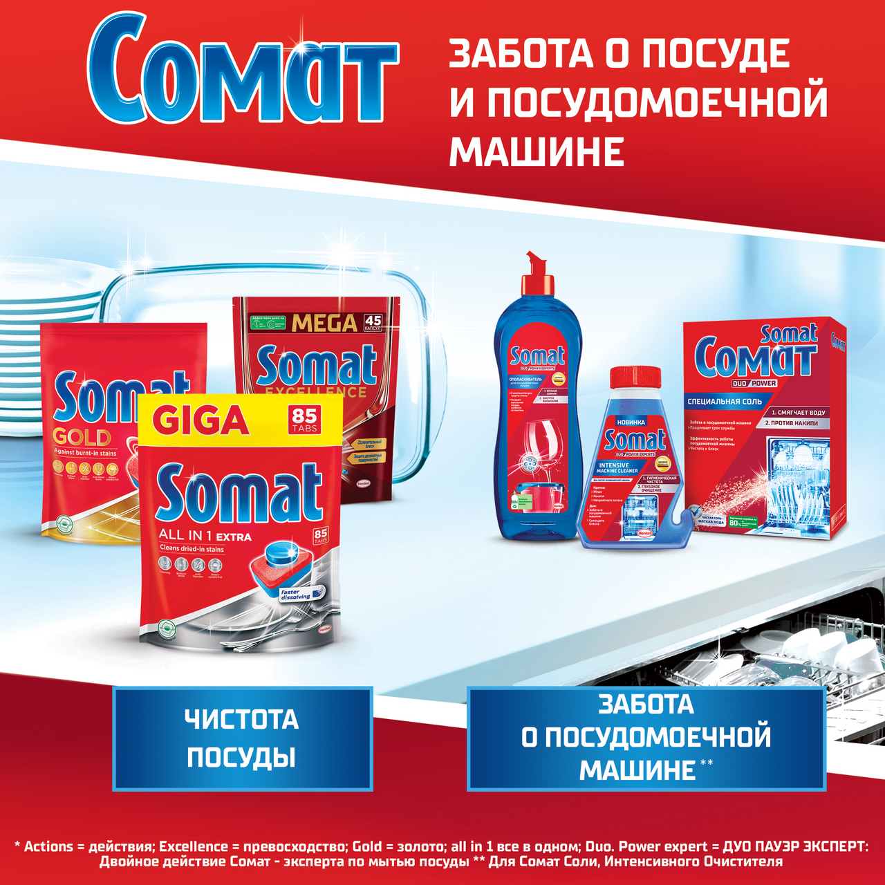 Таблетки Сомат для посудомоечной машины все-в-1 Экстра, 100шт обеспечивают чистоту посуды и самой техники. Средство гарантирует полное очищение посуды, даже от присохшей еды и пригоревшего жира. Таблетка Сомат быстро и без остатка растворяется и работает при температуре 40С. Нет необходимости в применении ополаскивателя и соли, все ингредиенты есть в таблетке. Средство Сомат позаботится о долгом сроке службы и надлежащем состоянии посудомоечной машины. Содержат 9 активных действий, которые обеспечивают великолепное очищение вашей посуды даже против таких трудных загрязнений, как присохшая еда. Эффективное очищение, помогает против пятен от чая и кофе. Таблетка быстро растворяется, сочетает в себе функцию ополаскивателя и соли.