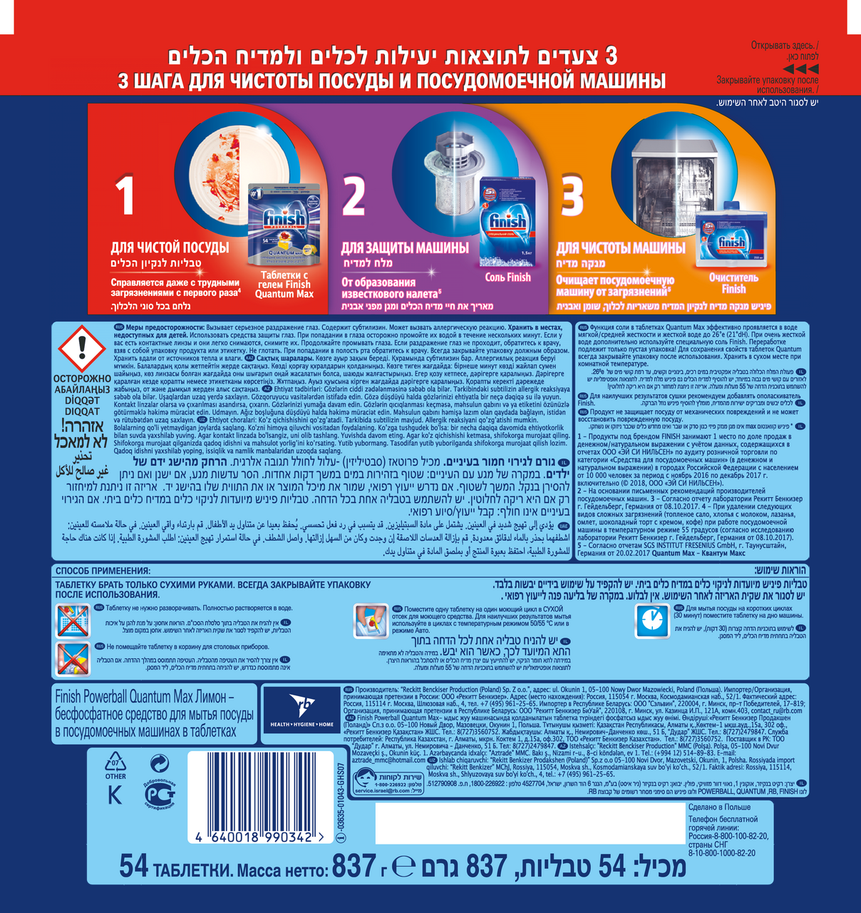 Рекомендации от Finish для наилучших результатов.Продукт не защищает посуду от механических повреждений и не может восстановить поврежденную посуду.Закройте упаковку должным образом, храните вдали от источников тепла и влаги.Переработке подлежит только пустая упаковкаМеры предосторожности: содержит субтилизин.Может вызвать аллергическую реакцию.Вызывает серьезное раздражение глаз.Хранить в местах, недоступных для детей.Таблетку брать только сухими руками, всегда закрывайте упаковку после использования. Таблетку не нужно разворачивать! Полностью растворяется в воде. Не помещать таблетку в корзину для столовых приборов.Поместите одну таблетку на один моющий цикл в сухой отсек для моющего средства.Для наилучших результатов мытья используйте в циклах с температурным режимом 50/55С или в режиме Авто.Для мытья посуды на коротких циклах (30 минут) поместите таблетку на дно машины.Срок годности: 24 месяца