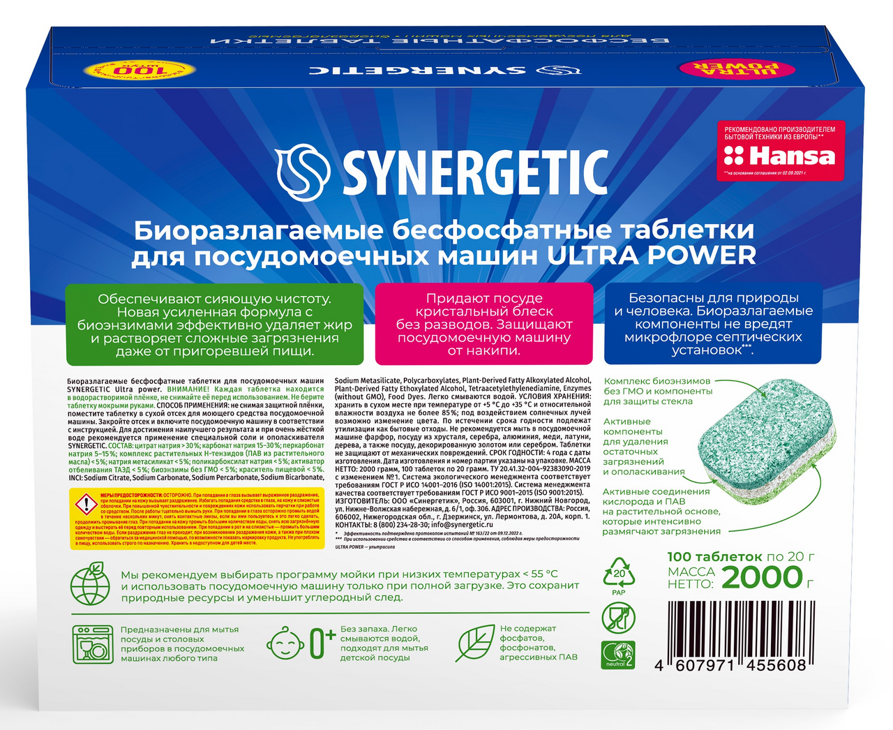 Таблетки для посудомоечных машин Synergetic Ultra Power в водорастворимой плёнке - это экологичное, безопасное и эффективное средство. Таблетки предназначены для мытья посуды, в том числе детской, и столовых приборов в посудомоечных машинах любого типа. Эффективны на сокращенных программах мойки длительностью не менее 60 минут. Новая формула с биоэнзимами эффективно удаляет жир и растворяет сложные загрязнения даже от пригоревшей пищи. Протеаза удаляет запекшиеся и засохшие белковые загрязнения, например, мясной фарш, яичный желток и др, амилаза удаляет запекшиеся и засохшие крахмальные загрязнения, например, мука, рис и др. Специальные добавки предотвращают повторное оседание загрязнений, помутнение стекла и придают посуде блеск без разводов, защищают машину от накипи. Легко смываются водой, не содержат фосфатов, фосфонатов, агрессивных ПАВ, ароматизаторов. Безопасны для природы и человека. Не вредят микрофлоре септических установок при использовании средства в соответствии со способом применения, соблюдая меры предосторожности.