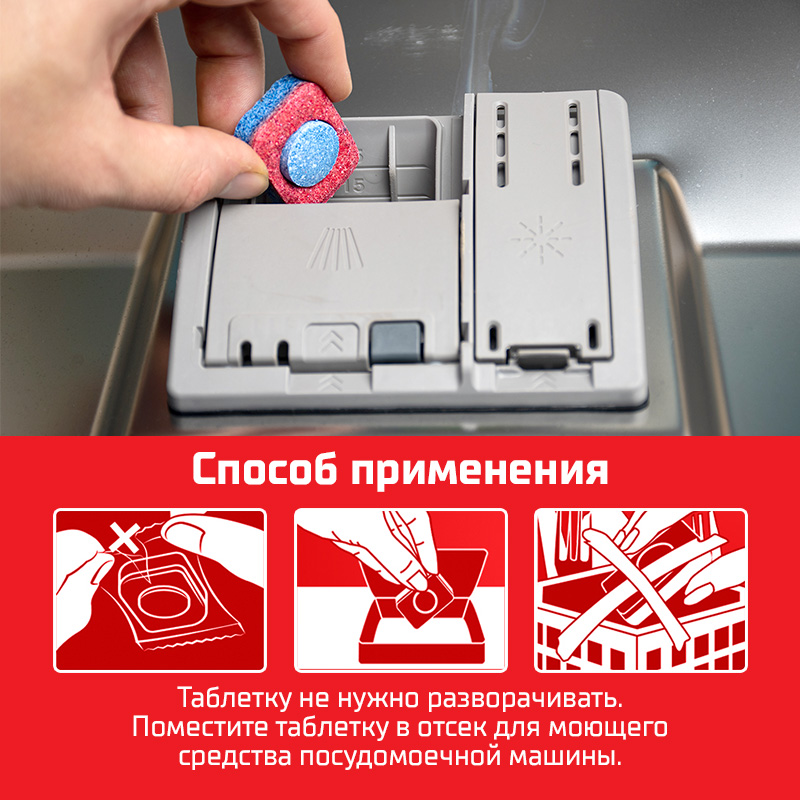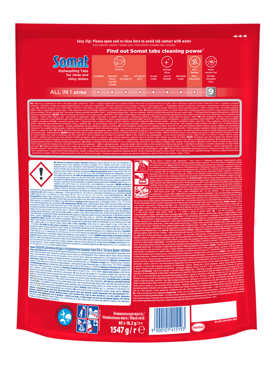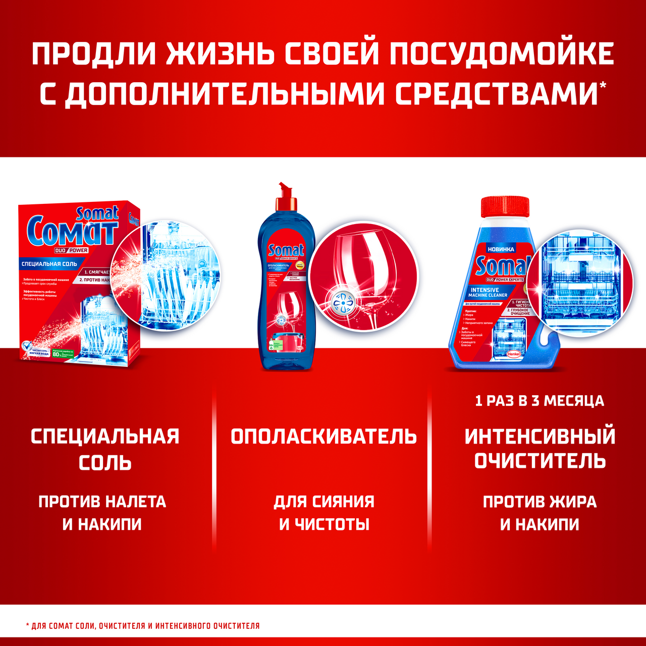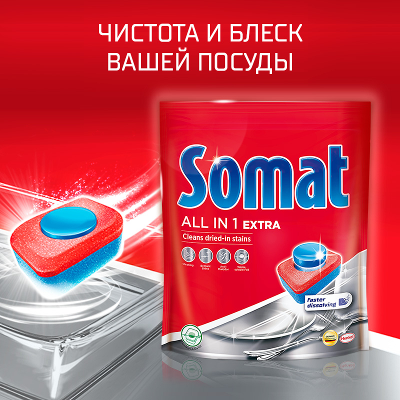 Обеспечивают чистоту посуды и самой техники. Средство гарантирует полное очищение посуды, даже от присохшей еды и пригоревшего жира. Таблетка Сомат быстро и без остатка растворяется и работает при температуре 40С. Нет необходимости в применении ополаскивателя и соли, все ингредиенты есть в таблетке. Средство Сомат позаботится о долгом сроке службы и надлежащем состоянии посудомоечной машины. Содержат 9 активных действий, которые обеспечивают великолепное очищение вашей посуды даже против таких трудных загрязнений, как присохшая еда. Эффективное очищение, помогает против пятен от чая и кофе. Таблетка быстро растворяется, сочетает в себе функцию ополаскивателя и соли.